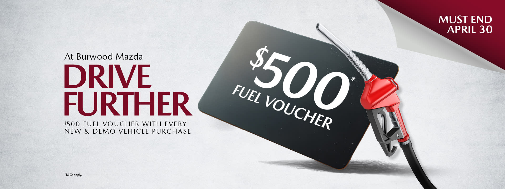 *Terms and conditions: Offer valid on in-stock new and demo vehicles purchased at Burwood Mazda between 01/04/26 and 30/04/26 and delivered by 30/04/26. Available only at Burwood Mazda. While stocks last. Not available to fleet, government or rental buyers, or in conjunction with any other offer. Offer does not apply to all-new CX-5 & Mazda 6e/CX6e models. $500 fuel voucher provided at time of delivery. Not transferable or redeemable for cash. Burwood Mazda reserves the right to modify, cancel or extend the offer at any time. LMCT 12232